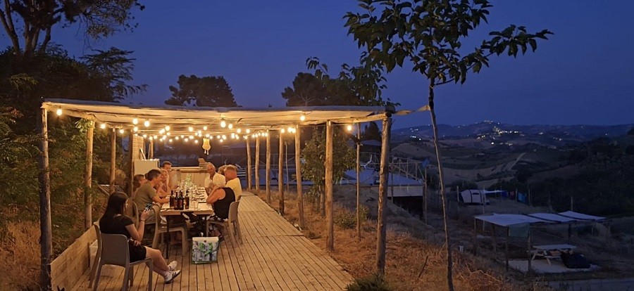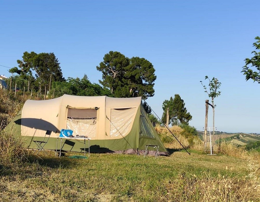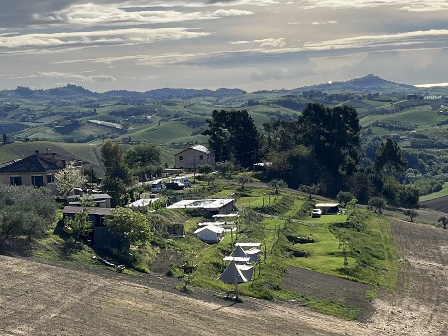 Een kleine autovrije agricamping met ruime kampeerplaatsen en huurtenten met vrij zicht over de heuvels op een terrein van 3 ha met olijfbomen, een moestuin en een lavendelveld vlakbij het middeleeuwse stadje Offida.
